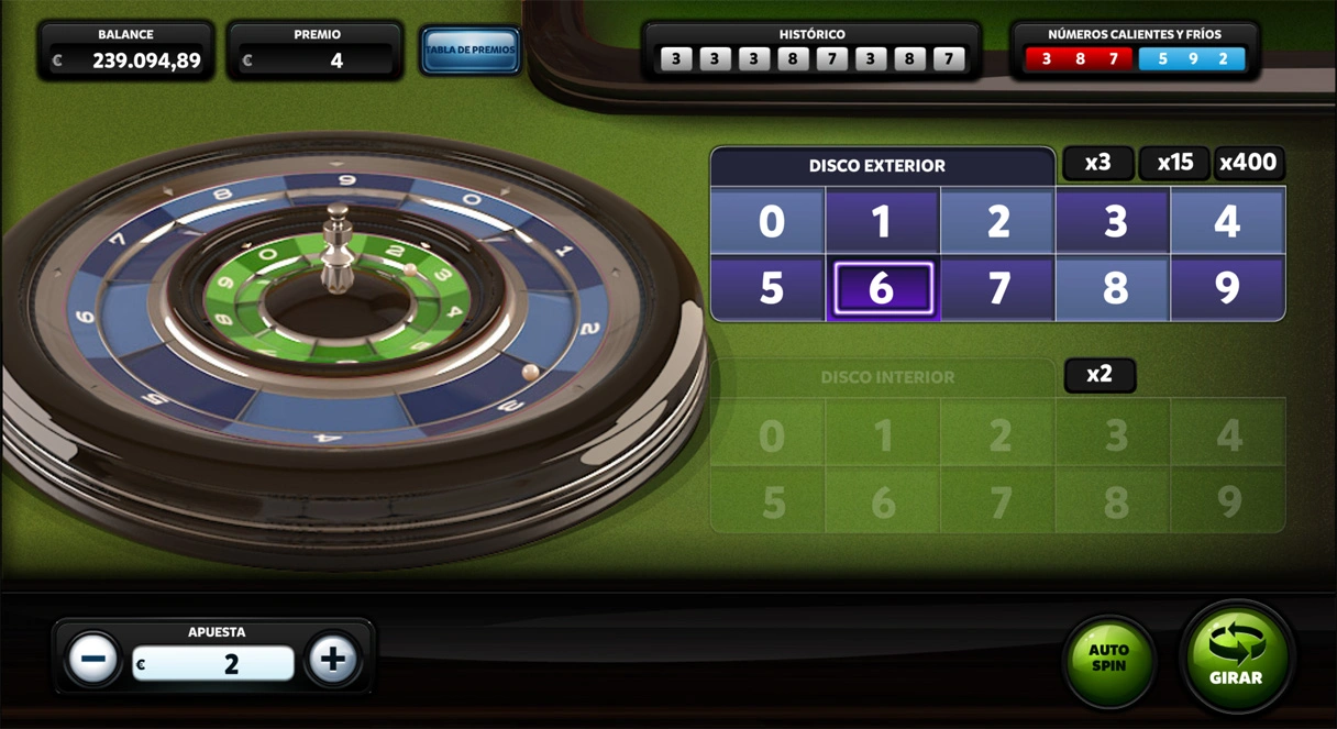 Novedoso juego de azar, cuyo objetivo consiste en acertar en qué números caerán las 2 bolas lanzadas en dos discos giratorios, consiguiendo el premio máximo en caso de salir el mismo número en los 2 discos. Cada uno de ellos contiene los números del 0 al 9, ambos inclusive.