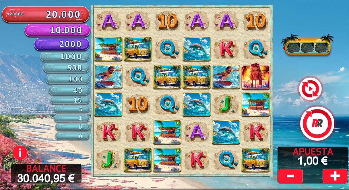 Conviértete en el Big Kahuna y consigue premio en cada ola en nuestra nueva slot de 6x6 rodillos con Cascading Reels, 46.656 modos de premio y panel de premios directos.