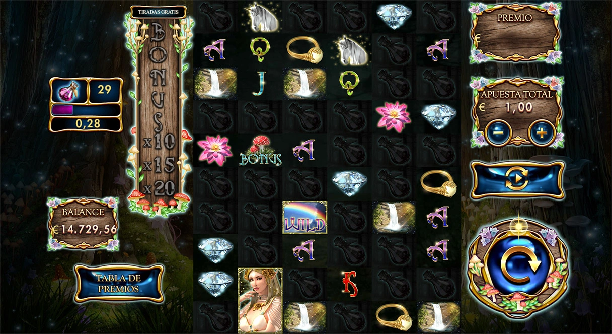 En un precioso bosque encantado y bajo una cascada se encuentra una bella Elfa que prepara pócimas mágicas que esconden maravillosos secretos. Acumula estas pócimas y desvela los premios que ocultan.