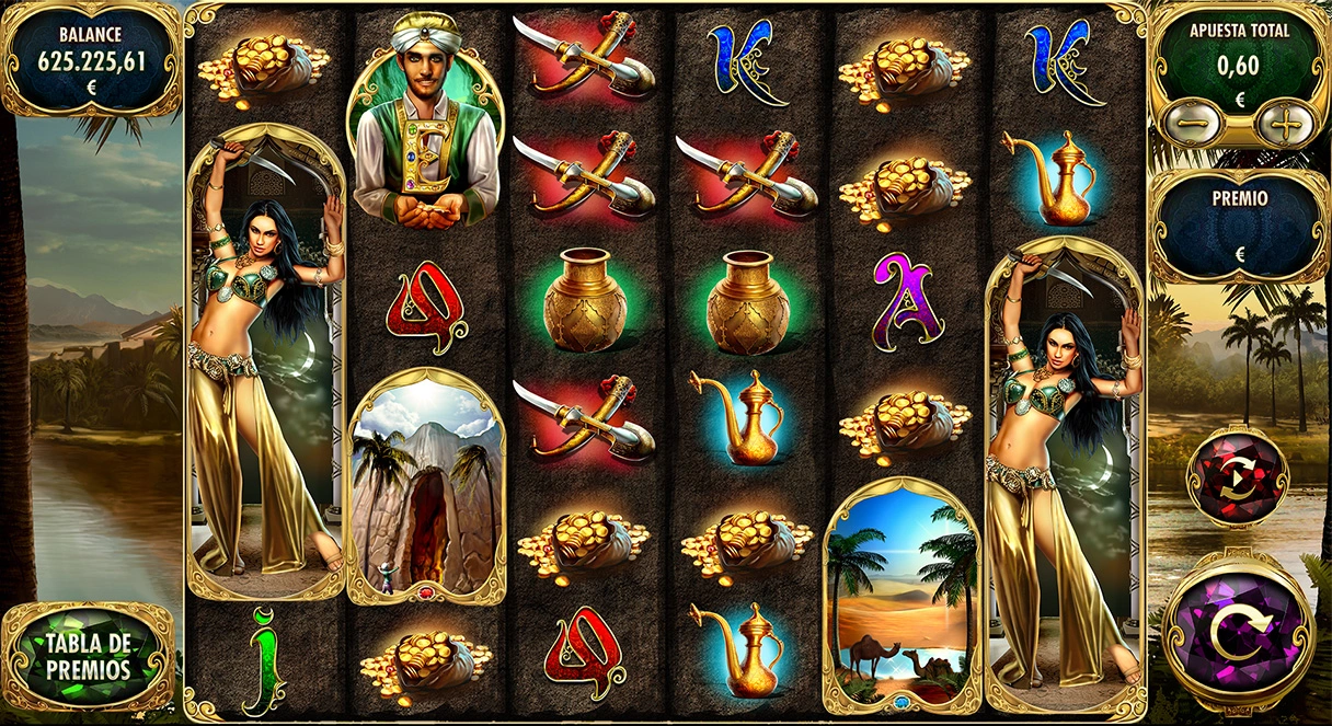 Entra en el mundo mágico de Alí Babá y consigue el tesoro de los 40 ladrones. Una videoslot de 6x6 rodillos con fase de tiradas gratis infinita.