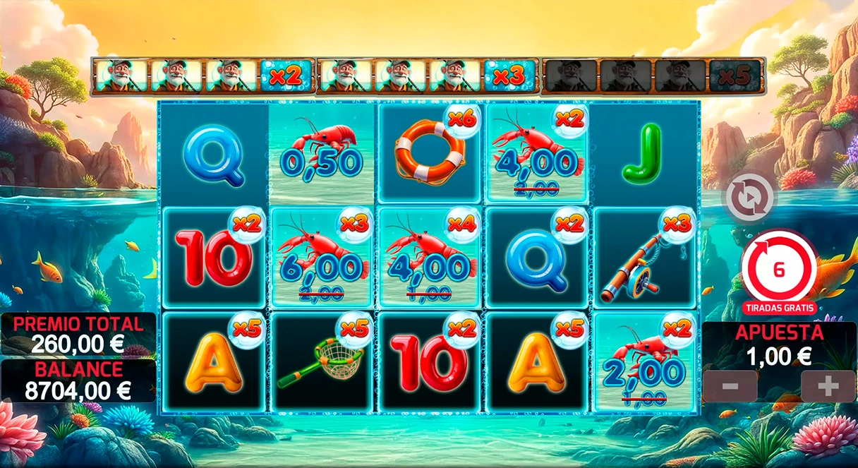 Sumérgete en esta slot 5x3 con 10 líneas de premio, donde cada langosta en casillas con multiplicadores aumenta su valor. Activa tiradas gratis, retriggers y deja que el pescador recoja las langostas para conseguir grandes premios.