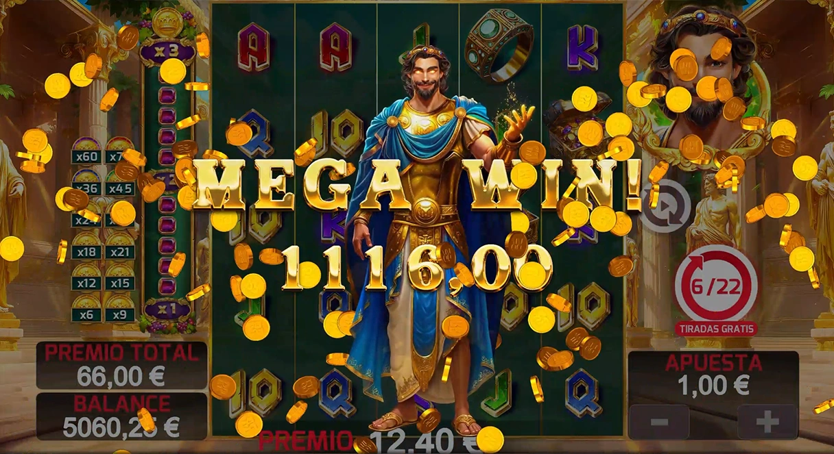 El legendario Rey Midas se sienta en su trono admirando sus tesoros. Poseedor del poder de transformar lo que toca en oro, te ayudará a convertir tiradas en premios.
