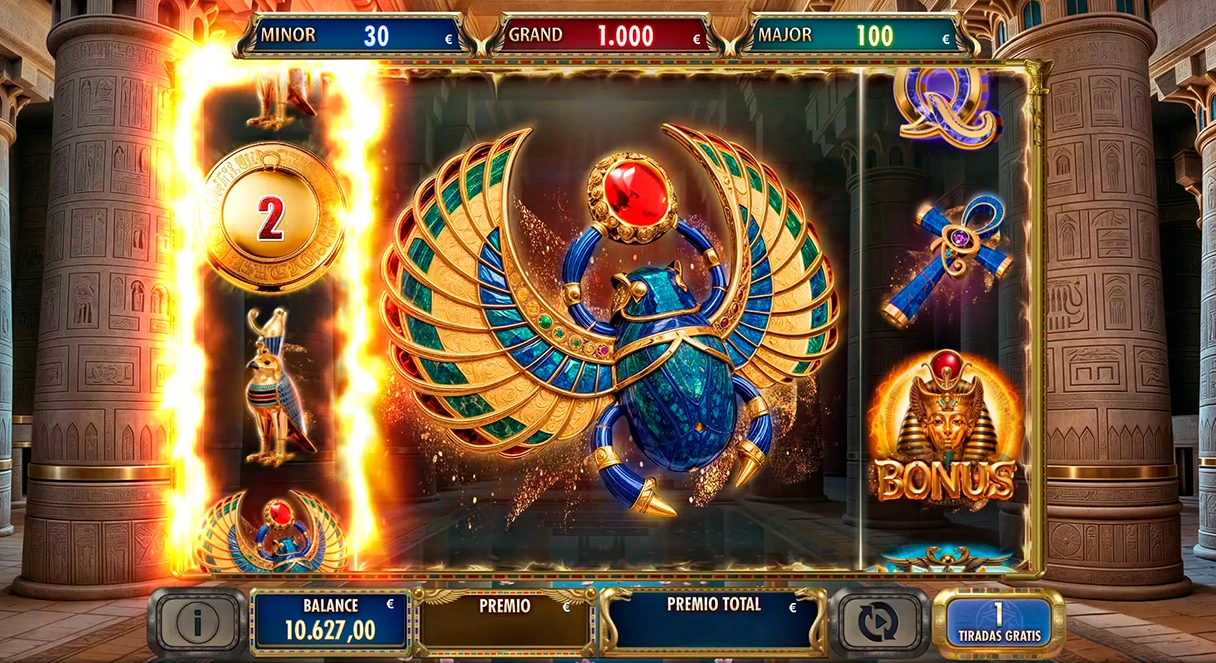 Adéntrate en la época dorada de Egipto en esta video slot de 5x3 rodillos y consigue el gran tesoro de Ra. Juega la fase de tiradas gratis y consigue las monedas de oro “Huge”.