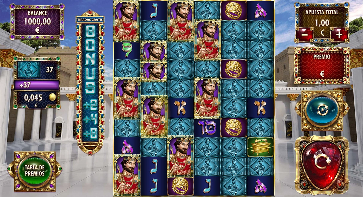 Viaja a la corte del rey Salomón en esta vídeo slot de 6x10 donde podrás conseguir grandes riquezas a través de un entretenido minijuego de fusión de símbolos y la fase de tiradas gratis con multiplicadores de la justicia.