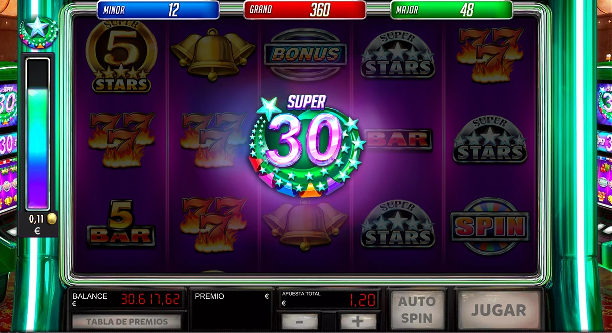 ¡No hay 25 sin 30! ¡Ya está aquí la nueva slot de la familia Super Estrellas con una gran novedad! El nuevo símbolo Super 30 Wild con barra de multiplicadores especiales. ¡Más mecánicas, más diversión!