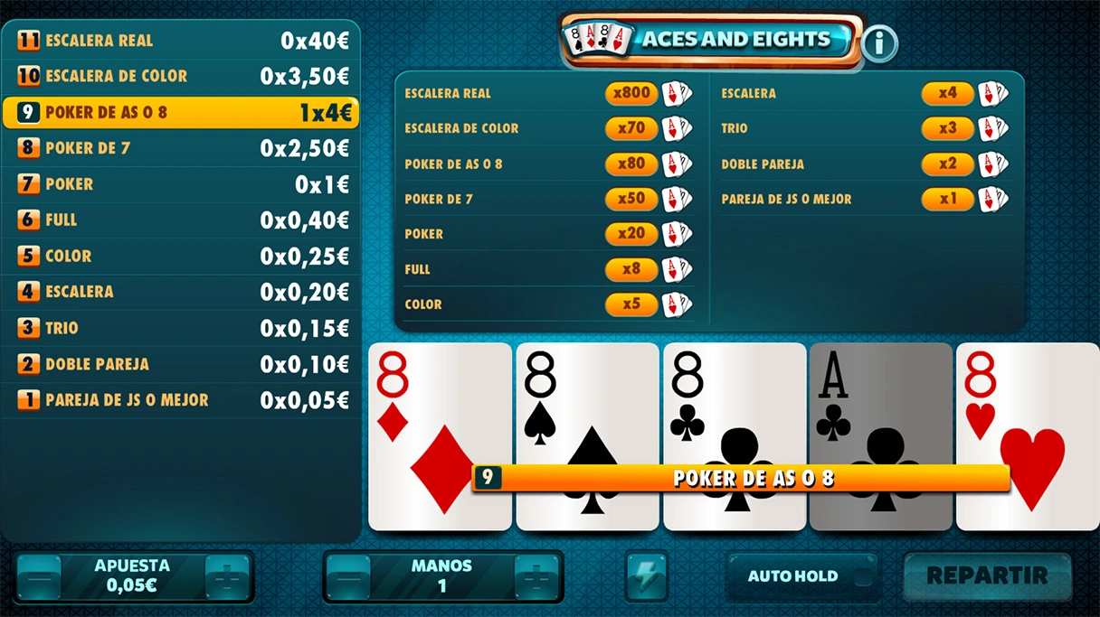 Aces & Eights: Cualquier jugada igual o superior a una pareja de Js tendrá premio.