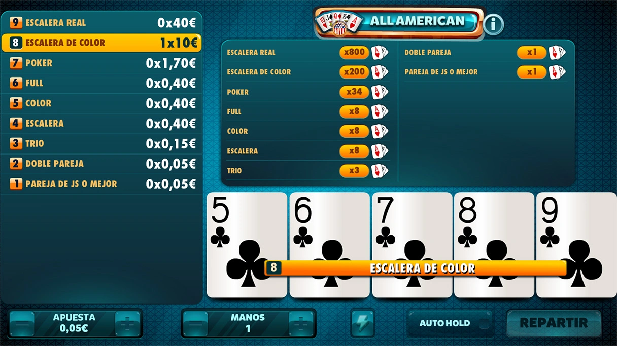 Modalidad muy parecida a “Jacks or better” donde deberás buscar las combinaciones de “Escalera de color”, “Escalera” y “Color” para llevarte los mejores premios. Por otro lado, las jugadas de “Full” y “Doble Pareja” perderían algo su valor.