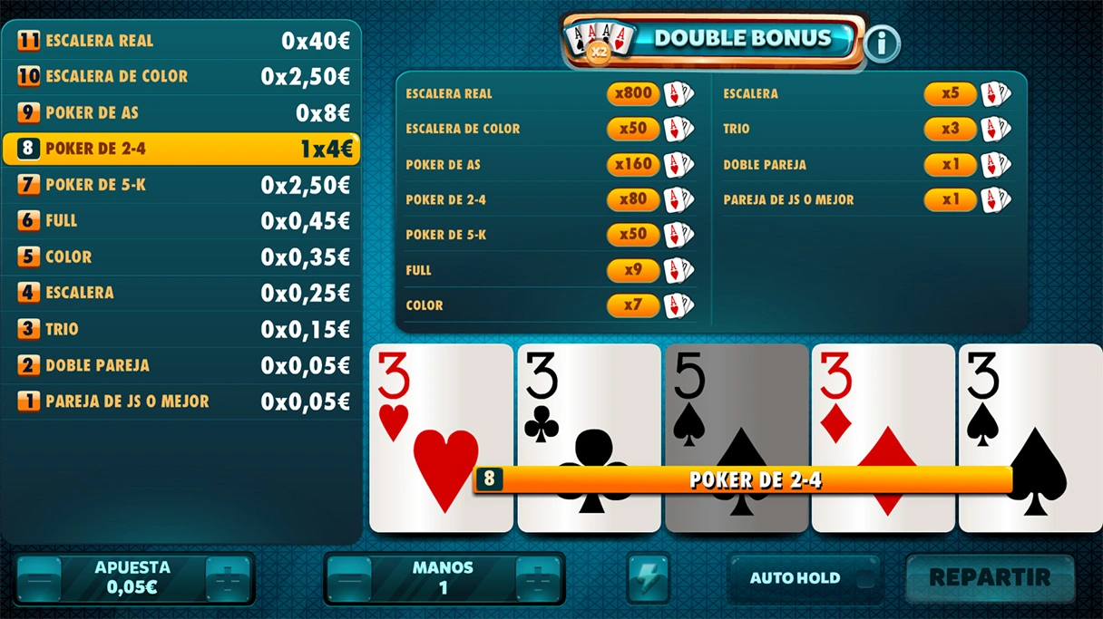 Double Bonus: Cualquier jugada igual o superior a una pareja de Js tendrá premio.