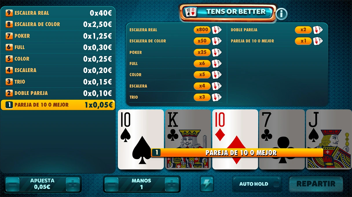Tens or Better: Cualquier jugada igual o superior a una pareja de 10s tendrá premio.
