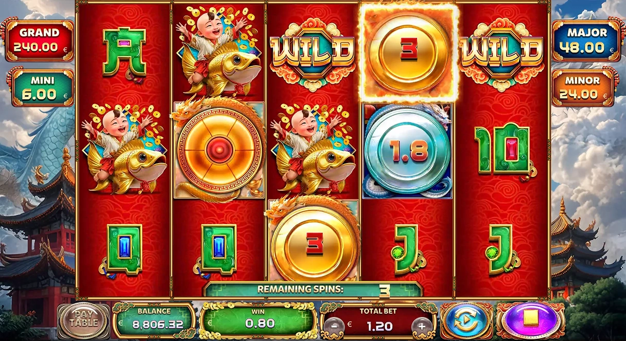 This 5x3 reel slot transports players into the world of the Chinese gods of fortune. More chances to win come with the “Locked Gold Coins”, the “Locked Spins” feature, and a prize-filled wheel that brings you the gods’ luck.